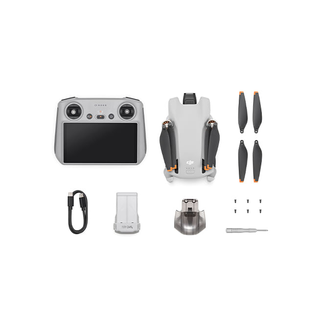 Incluye: ×1 DJI Mini 3 - ×1 Control remoto DJI RC - ×1 Batería de vuelo inteligente - ×1 Hélices de repuesto (par) - ×6 Tornillos de repuesto - ×1 Destornillador - ×1 Cable Type-C a Type-C PD - ×1 Protector del gimbal
