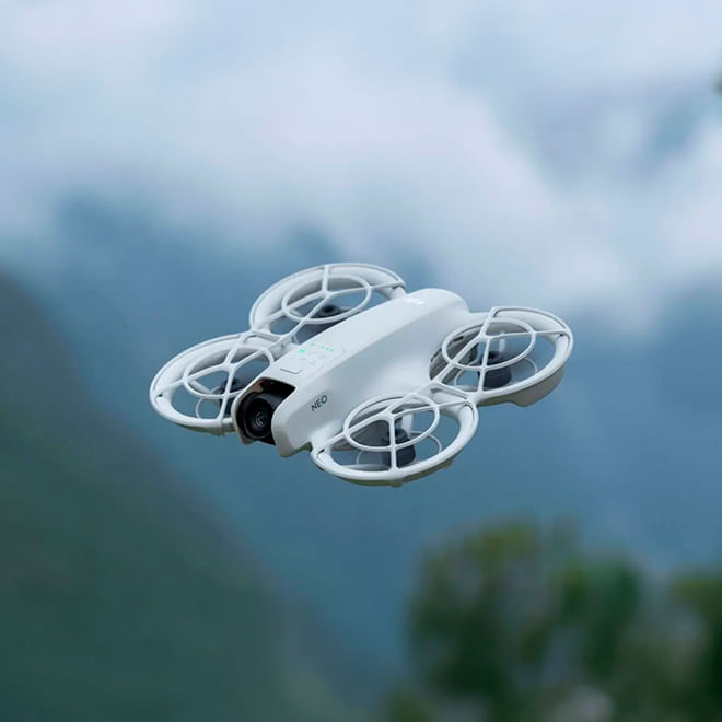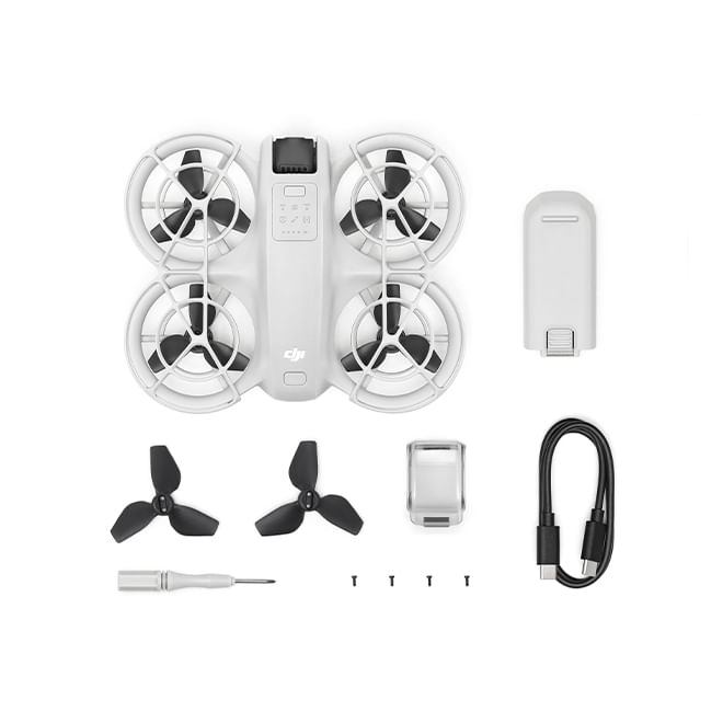 Incluye: × 1 DJI Neo - × 1 Batería de vuelo inteligente - × 1 Protector de hélice (par) - × 1 Hélices de repuesto (par) - × 1 Protector de cardán - × 1 Cable PD tipo C a tipo C - × 1 Destornillador - × 4 Tornillo de hélice de repuesto