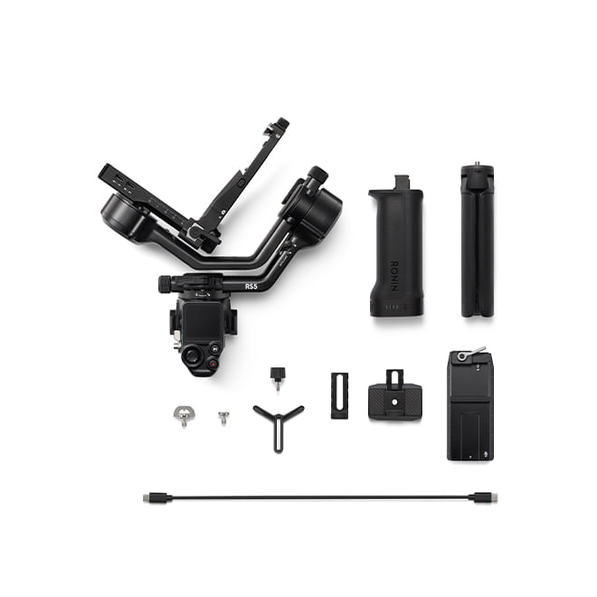 Incluye: x1 Cardán - x1 Trípode de apertura rápida - × 1 Soporte de fijación de lentes - × 1 Kit de tornillos - × 1 Placa superior de liberación rápida RS 5 - × 1 Placa de liberación rápida inferior RS 5 - × 1 Empuñadura de batería BG33 - × 1 Cable de control multicámara (USB-C, 30 cm) - × 1 Pegatina del logotipo de DJI