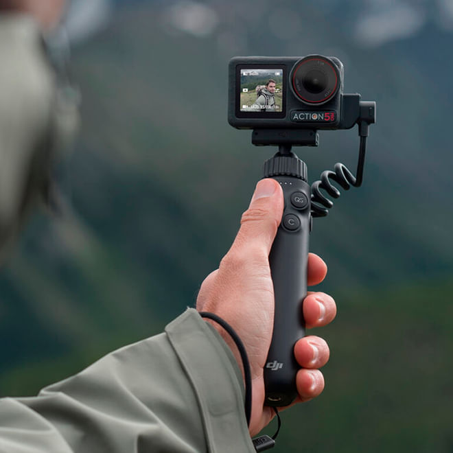 Mango de carga multifuncional Osmo Action: accesorio con batería integrada de 4900 mAh para hasta ~7 h de uso, control de cámara incorporado, liberación rápida magnética, ajuste con rótula, adaptador de audio 3,5 mm, soporte de trípode y rosca 1/4″ para expansión.