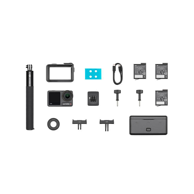 Incluye: × 1 Osmo Action 4 - × 3 Batería Osmo Action Extreme - × 1 Marco protector horizontal-vertical Osmo Action - × 1 Soporte adaptador de liberación rápida Osmo Action - × 1 Adaptador de liberación rápida Osmo Action (Mini) - × 1 Base adhesiva curva Osmo Action - × 1 Tornillo de bloqueo Osmo - × 1 Cable PD de tipo C a tipo C - × 1 Estuche multifuncional para baterías Osmo Action - × 1 Varilla de extensión Osmo de 1,5 m - × 1 Parasol para objetivo Osmo Action - × 1 Almohadilla antideslizante Osmo Action