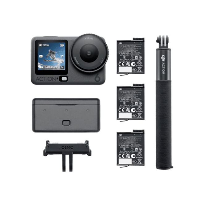 DJI Osmo Action 6 Adventure Combo: cámara de acción robusta con sensor CMOS cuadrado de 1/1.1″, apertura variable f/2.0-f/4.0, video hasta 4K a 120 fps, estabilización electrónica avanzada, 50 GB internos, modo SuperNoche para baja luz, sumergible hasta 20 m y autonomía prolongada — ideal para aventuras y contenidos.