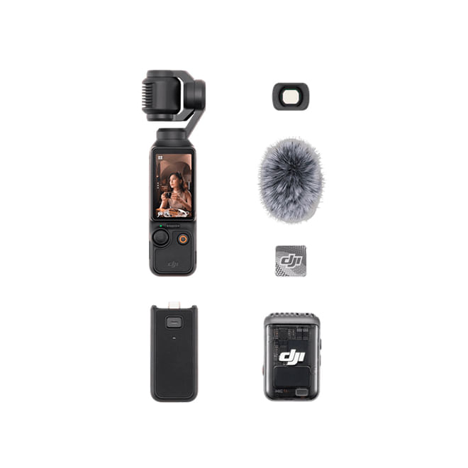 Incluye: × 1 Osmo Pocket 3 - × 1 Type-C to Type-C PD Cable - × 1 Osmo Pocket 3 Protective Cover - × 1 DJI Wrist Strap - × 1 Osmo Pocket 3 Handle With 1/4? Thread - × 1 Osmo Pocket 3 Wide-Angle Lens - × 1 DJI Mic 2 Transmitter (Shadow Black) - × 1 DJI Mic 2 Windscreen - × 1 DJI Mic 2 Clip Magnet - × 1 Osmo Pocket 3 Battery Handle - × 1 Osmo Mini Tripod - × 1 Osmo Pocket 3 Carrying Bag